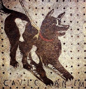 Parimenti, veicolo di scambio per eccellenza, la moneta e il conio comunicano e diffondono immagini come nessun altro mezzo nel mondo antico. Una grande quantità di monete testimonia come l’immagine del cane costituisca presenza costante nell’iconografia romana, a partire dal mito della fondazione: la lupa che allatta Romolo e Remo. Spesso è difficile stabilirne la razza ma sappiamo che i romani impiegavano i cani nella caccia così come li possedevano per affezione oltre che per porli a guardia delle proprietà come testimoniano i mosaici pompeiani recanti “Cave Canem”.