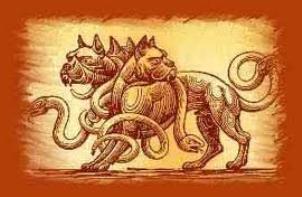 Cerbero, custode del regno di Ade nella mitologia greca e romana, è creatura con il corpo di cane, tricefalo con coda di serpente. Il suo compito è quello di accogliere l’arrivo delle anime dei defunti e di impedire loro di tornare indietro. Compare come ultima Fatica di Ercole ed è figura presente in tutti i racconti di eroi che scendono nell’Ade. Dante ne riprende il mito in epoca medioevale ponendolo a guardia dei golosi.
